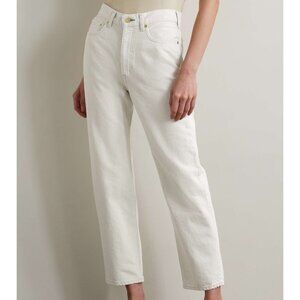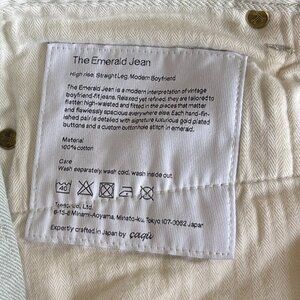 The Emerald Jean is a modern interpretation of vintage boyfriend jeans. Relaxed yet refined, they are tailored to flatter; high-waisted and fitted through the hips with a relaxed silhouette. Each hand-finished pair is detailed with signature gold plated buttons and a custom buttonhole stitch in emerald.