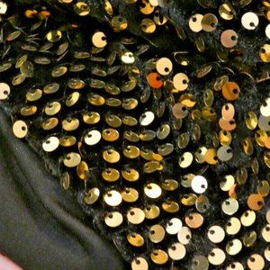 The stretchy fabric is black and it is covered with golden sequins front and back. There is a turtleneck type black collar. This top is a size 8 in the USA. I bought this in the UK and that is why the label says UK-12. Their sizing is different than the US.