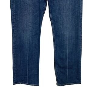 Features: dark wash denim. cotton polyester blend. slim fit in the leg with a slight flare. five pocket style. finished with gold plated buttons. custom buttonhole stitch in amethyst. made in japan