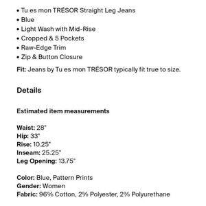 The Tu es mon TRESOR Rose Quartz Jean in size 26 is a stylish and versatile addition to any wardrobe. These mid-rise skinny cropped jeans feature a light wash denim fabric, 4 pocket design, zip closure, and a high waist for a flattering fit. Made from a comfortable cotton blend, these jeans are suitable for all seasons and can be easily cared for with machine washing. A classic denim style, making them a great choice for casual or designer looks. Crafted in Japan, these jeans are a must-have for any fashion-forward woman. Pre-owned