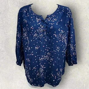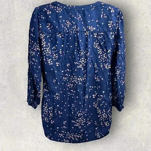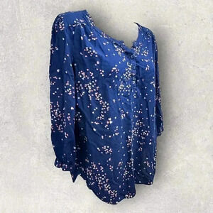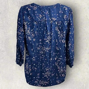 Tu women's blouse blue with pink hearts 3/4 sleeves, 1/4 button front shirt