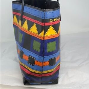 This is a beautiful Tua Braccialini Large Black Multi Color Block Tote. Open tote with double handles. This is a rare print. Scuffs and scratches throughout. Can be touched up at a good shoe repair. Slight corner wear which has been touched up. No odors. No tears. Smooth leather interior, no pockets. 16”W x 11.5”H x 5.25”D with 10.5” straps
