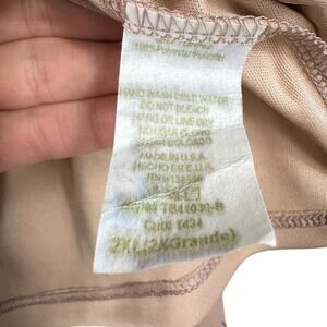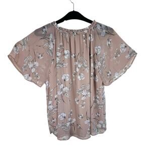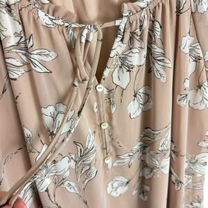 Excellent preowned condition. Mauve with white floral print short sleeve lined lightweight blouse. Sleeves are sheer. Ties at neck. Polyester material. Approx. measurements: Shoulder to hem 29", pit to pit 25". Size 2X.