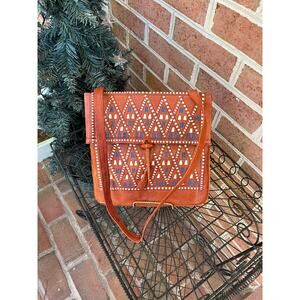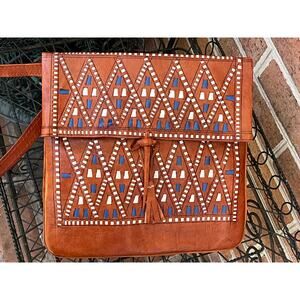 Handmade from thick tan leather with colorful woven detailing. The strap is long enough to wear the bag at the shoulder or cross-body with it sitting above the hip. Under the flap, you'll find one long narrow main pocket.