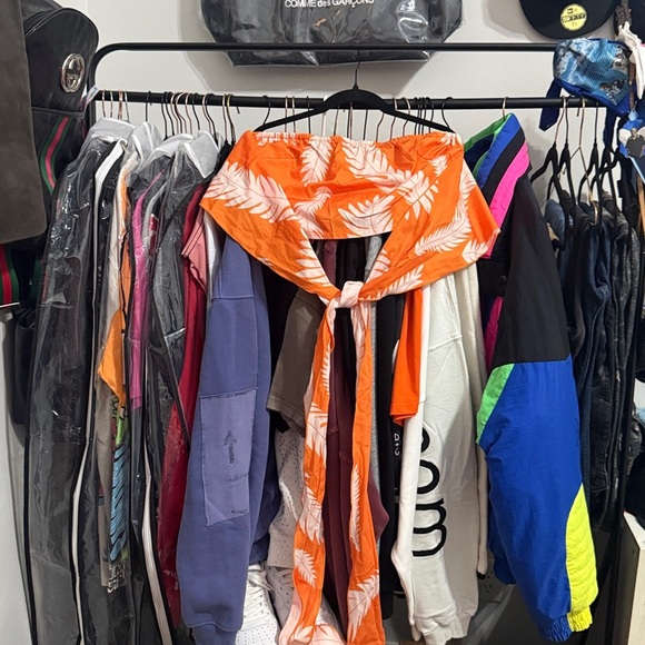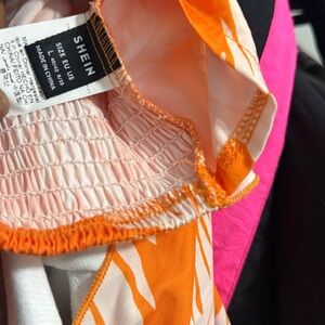 Bright orange tube top with white abstract design. Ideal for a bold look.