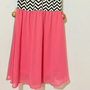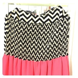 Cute black and cream chevron print tube top dress with flowy pink chiffon. Knee length, size Small, Foreign Exchange dress.