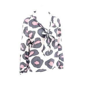 Tucker 100% Silk Leopard Print White Long Sleeve Tie Front Blouse USA Size Small