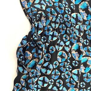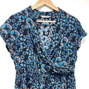 TUCKER by NYC designer Gaby Basora. Blue and black short sleeved knee-length draped front faux wrap 100% silk dress, size large. Geometric shapes in shades blue and orange print over a black background. Unlined.