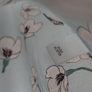 A classic floral print in blue with lightly ruffle sleeves. Crewneck and short sleeves. Made of silk and cotton.