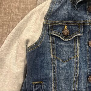 This stylish jean jacket from Tucker + Tate features a classic blue denim body paired with cozy gray sweatshirt sleeves and hood, offering a perfect blend of durability and comfort. Ideal for casual outings, this jacket is a versatile addition to any wardrobe.