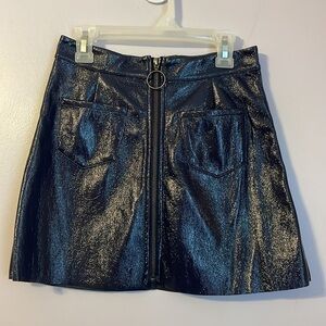 Tucker + Tate Faux Leather Vinyl Zip Front Mini Skirt Dark Blue size 10. Very good preowned condition. Small pockets on front. Very shiny. Blue color may look little purple in different lighting. See pictures for approximate measurements.