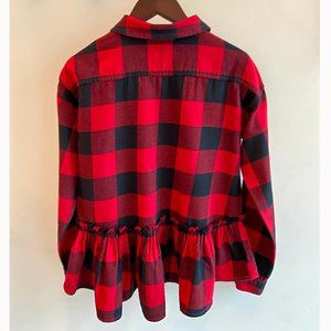 The tried-and-true flannel shirt in Buffalo check is revamped for the season with a ruffled, high/low hem.