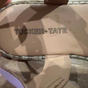 These adorable Tucker + Tate sandals feature a lilac faux leather strap with a sparkly pink glitter crossover design. Lightweight and comfortable with an adjustable buckle ankle strap and cushioned footbed. These are the perfect addition to any summer outfit, from playdates to parties! Gently worn with minimal signs of use, as shown in photos.