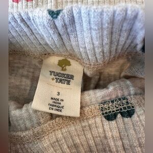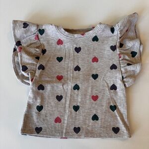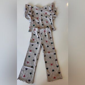 Charming ribbed set with colorful heart design. Features ruffled sleeves and flare bottoms. The bottom is faded compared to the top. There is some pilling on the set