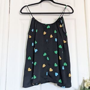 Black top with heart prints in yellow, blue and green. Adjustable spaghetti straps that will allow you to create a shirred neckline. Crewneck.