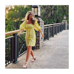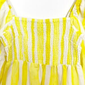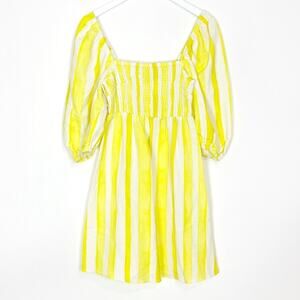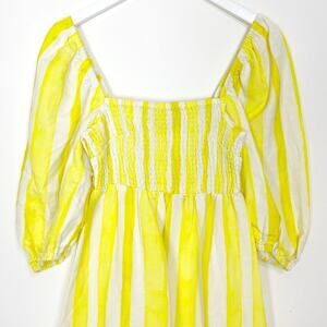 Tnuck x Cameran Eubanks Wimberly. Linen blend dress with square neckline, puff sleeves, and smocked bodice. Yellow and white cabana stripes.