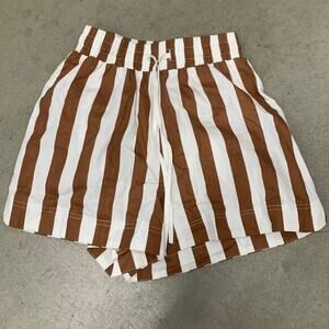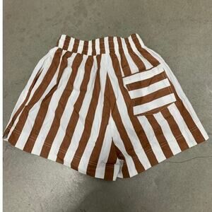 The Harvey Short in Cigar/Optic stripe cotton poplin features elasticised waist with Optic tie detail and curved wide stitched hem detail.