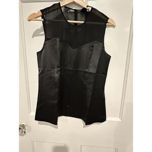 This top features a sheer panel at the upper chest and a fitted silhouette. It appears to be made from a satin-like fabric, giving it a slightly formal look.