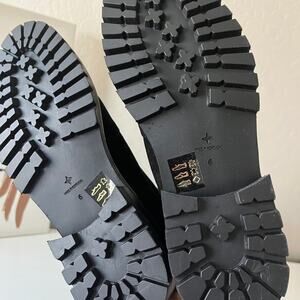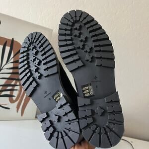 Tuckernuck Black Kyle Lug Boots. The sole has enough traction to keep you from slipping and sliding while the lace up, knee-length silhouette is the perfect mix of classic features and bold style. With an almond shape toe and suede exterior, this style pairs well with denim, maxi dresses, mini skirts. Solid black.