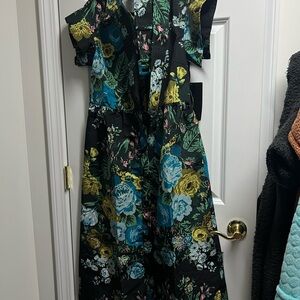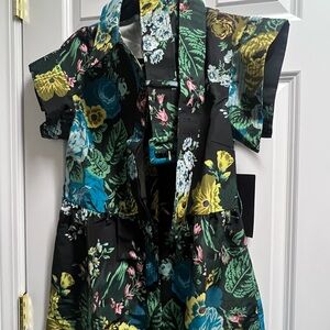 Chic black midi dress with vibrant floral pattern. Features a stylish belt. Ideal for versatile wear. NWT.