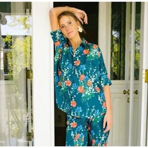 Tuckernuck Blouse Jade Blooms Farris Button Up Top Glass Button Black Tie S