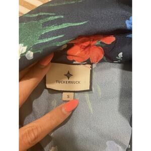 Elevate your wardrobe with this stunning Tuckernuck blouse in Jade Blooms Farris design. Featuring a button-up top with glass buttons and a black sash, this blouse is perfect for any occasion. The size is S, and it is suitable for regular size types. The blouse is an excellent addition to any woman's wardrobe, and it comes in a beautiful green color.