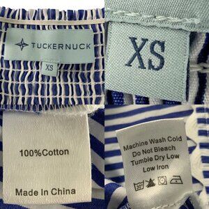 This Tuckernuck Georgia Dress makes a statement due to it's sleeveless A-line silhouette, adjustable straps, side zipper with hook/eye, maxi hem, scallop trim, pockets, smocked back, empire waist, square neckline and blue/white striped design.
