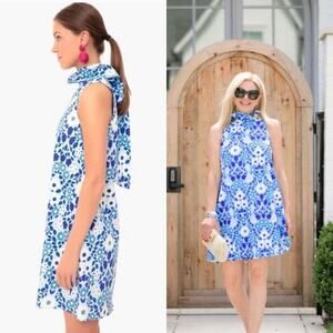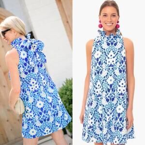 A Tuckernuck style staple, the Blythe is back and better than ever. Our design team spent months perfecting and testing our signature stand collar to get it just right. As Marvin Gaye once said: "Ain't no collar high enough," so bring on the ruffles and drama! Updated in a beautiful stretch crepe fabric, this swing shape mini dress reminds us of our favorite mod dresses from the 60s and 70s. Ready for al fresco dinners with family, cocktail parties with friends, and every social event on your calendar, the occasions are endless for this bow tie-back dress!