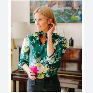 Tuckernuck Bouvier Blouse Green Floral Ruffle Collar Blouson Sleeves Size XS