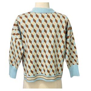 Tuckernuck Ocean Spray Geo Clayton Knit Polo Top Light Blue Tan Retro Boxy 3/4 Sleeve Size XS/S