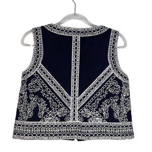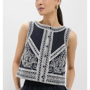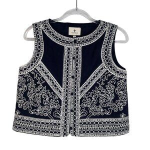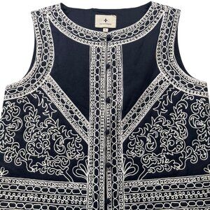 Tuckernuck Embroidered Luna Top in Navy & White Size Small Linen & Cotton
