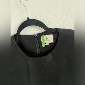 “This Sabrina Blouse from Tuckernuck is an ideal pick for a night out or a chic gathering. Featuring a feather-trimmed hemline, round neckline, and three-quarter length sleeves, it adds a touch of flirty sophistication. The slightly cropped, lined design ensures elegance and comfort, while the back zip allows for easy wear. Pair it with black pants and heels for a striking ensemble. Material: 100% Polyester, Lining: 97% Polyester, 3% Spandex. Care: Dry clean only. “