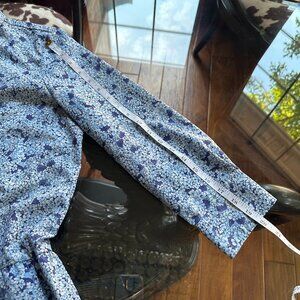 Tuckernuck Hayes Blue Hydrangea Button Front Shirt Dress. Women's size Medium. Blue and white floral print wrinkle-resistant polyester. Lightweight and flowy with a relaxed/oversized fit. Button front with side pockets. Unlined. Can be dressed up or down. Perfect for brunch with cute flats or with sambas for a day of running errands. Excellent, like-new condition. No visible flaws. Clean, smells good. Smoke-free home.