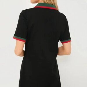 Stylish black polo dress featuring green and red accents on the collar and sleeves. Perfect for casual outings.