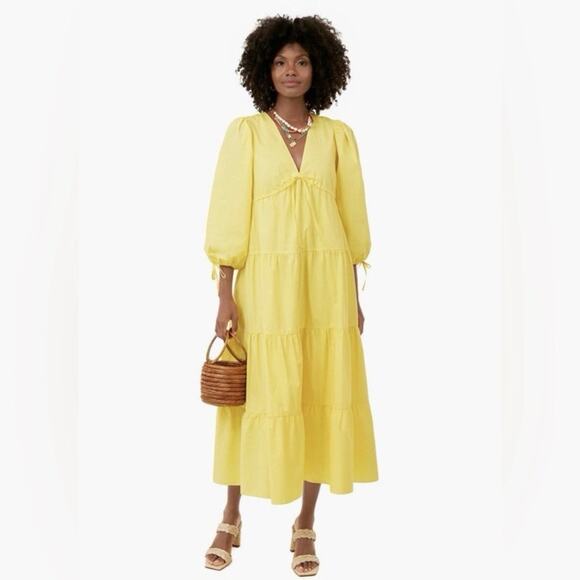 Tuckernuck Hyacinth House Mila V Neck Cotton Tiered Midi Dress in Yellow Size XS