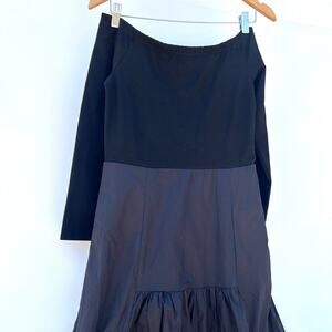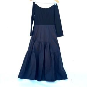 This timeless Tuckernuck Marissa dress blends classic elegance with effortless charm. Featuring an off-the-shoulder neckline and tiered A-line skirt, it creates a flattering feminine shape. The full midi length and crisp black fabric make it ideal for cocktail parties, formal events, or holiday gatherings. Style it with heels and statement earrings for a polished, modern look.