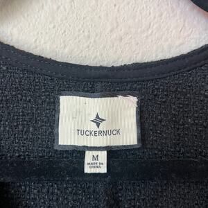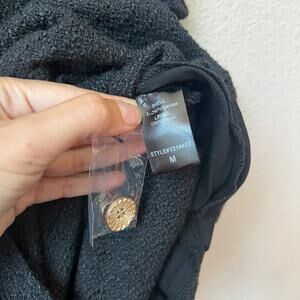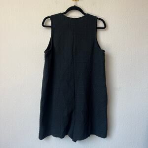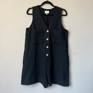 Tuckernuck 'Myla' romper features a textured black fabric with gold-tone buttons, a V-neckline, side pockets and front patch pockets. Fully lined with a relaxed fit that’s easy and refined for summer outings or casual nights out. Size Medium, oversized fit - 21" pit to pit; 3" inseam.