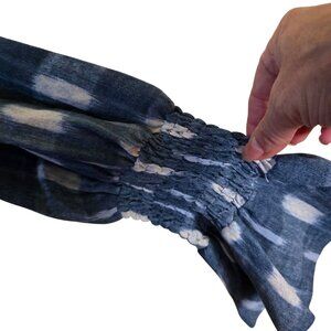 Embrace effortless style with this Tuckernuck Pomander Place swing dress. Featuring a blue Ikat pattern, it boasts a ruffle design, puff sleeves, and a smocked bodice for a flattering fit. Perfect for any occasion. Retail $128