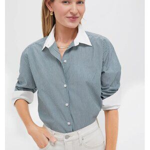 Classic and timeless, the Nadine Boyfriend Button Down is one of Tuckernuck’s most-loved styles. This version features crisp green stripes with contrasting white collar and cuffs, giving it a polished, prep-inspired look that’s perfect for everyday wear or office styling.