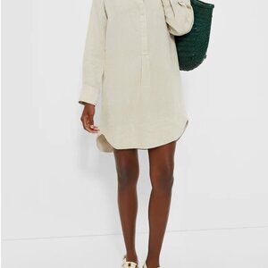 Tuckernut says: "An easy, timeless classic, the Natural Emilia mini dress is a spring summer staple that can do it all. Crafted from luxe linen, this shift mini features a stand collar with elegant buttons on the placket, long sleeves, curved hem providing a little swing." Shift silhouette, 100% linen, Hand wash cold, hang to dry.