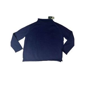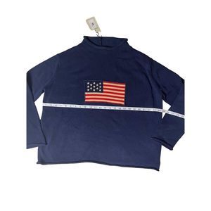 Navy crew neck sweater. Features American flag design on front. Comfortable and stylish.