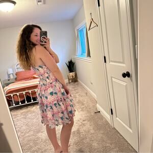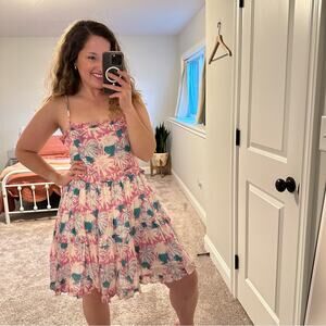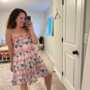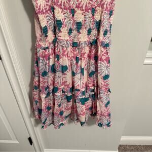 I love this super cute designer Tuckernuck Oliphant pink blue floral block printed tropical palm tree bird print strappy smocked mini dress