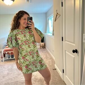 wow, I absolutely adore this super pretty designer Tuckernuck Olivia James The Label green pink floral botanical printed puff sleeve linen mini dress