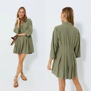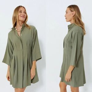 Chic and classic while still boasting a modern silhouette, the Jade Green Darien Dress is checking all the boxes. Designed with our famous stand collar that adds a polished finish to any look, this mini is complete with a hidden front placket and elevated pleats at the waistline. Pair with sandals for backyard get-togethers with friends and loafers for an effortless desk to drinks look– from work to play, this tailored style does it all.