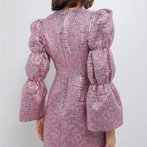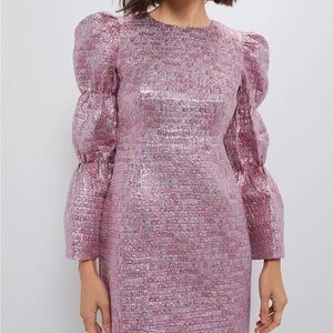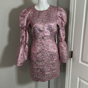 Elegant long sleeve dress with puffed shoulders. Shimmering pink fabric. Perfect for special occasions.