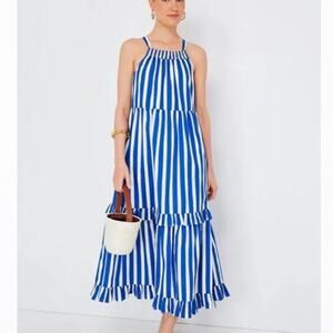 Tuckernuck Pomander Place Avondale Dress in Blue Stripe. Size XXL / Extra Extra Large. Features smocked square neckline, sleeveless, tiered construction with ruffle trims, back keyhole with tie closure, striped print, and maxi length. Style B1049. 97% Cotton, 3% Spandex. Excellent condition, no flaws.