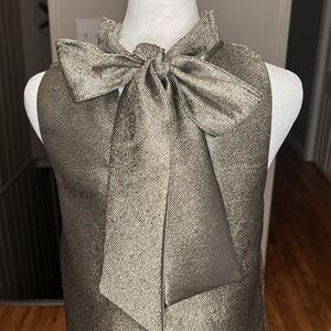 This high neck ruffle blouse is the perfect combination of classic and fun. It's traditional design is perfect for NYE or a night out. You'll love this new Tuckernuck favorite! Back tie bow. High neck. Sleeveless shirt top blouse with high ruffled neck. Ties behind the neck at the back into a bow. Tank style shirt. Metallic sparkling piece. Swing shape, keyhole back, reinforced stand collar.