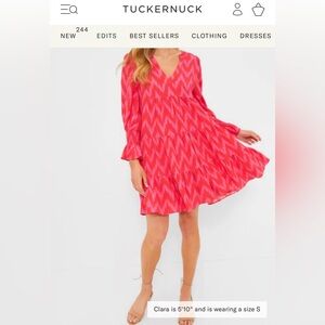 This Tuckernuck sundress in a vibrant pink hue is perfect for casual or resort wear. Featuring a v-neckline and long bell sleeves, it offers a stylish and comfortable fit. The dress's lightweight fabric and flattering silhouette make it an ideal choice for warm weather outings.