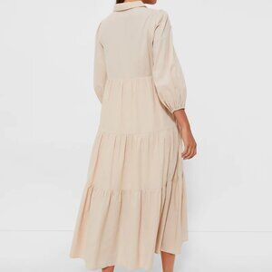 In gently used condition - no flaws/rips/stains. Material: 100% Cotton, 100% Rayon (lining). Featuring a tiered maxi skirt combined with puff sleeves in a creamy tan color, the Sandstone Mabel Dress is perfect for three seasons a year, ready to quickly become a closet staple. With a collared neckline and half front placket, this effortless piece evokes a sophisticated, relaxed feel. This no fuss maxi can be worn all day from school drop offs and errands to dinners with friends, making your day a breeze with this easy silhouette.