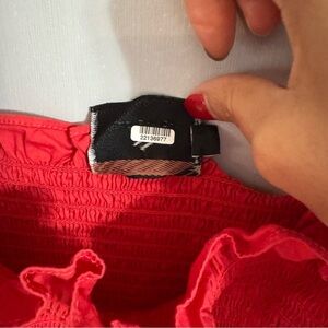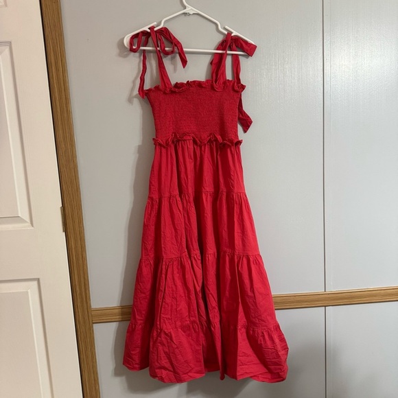 This elegant reddish red midi dress features charming ruffle straps and a smocked bodice. It is perfect for any occasion. Its vibrant color and flowing design make it a standout piece in any wardrobe.